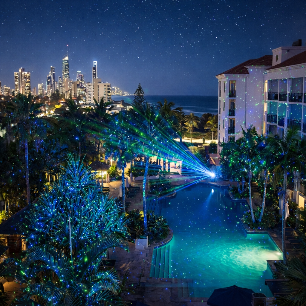 NEW: Professional-grade lighting system used by expert landscape designers, now available for your home or special event..Australian safety certification, IP65 rating, and 100-milliwatt laser.