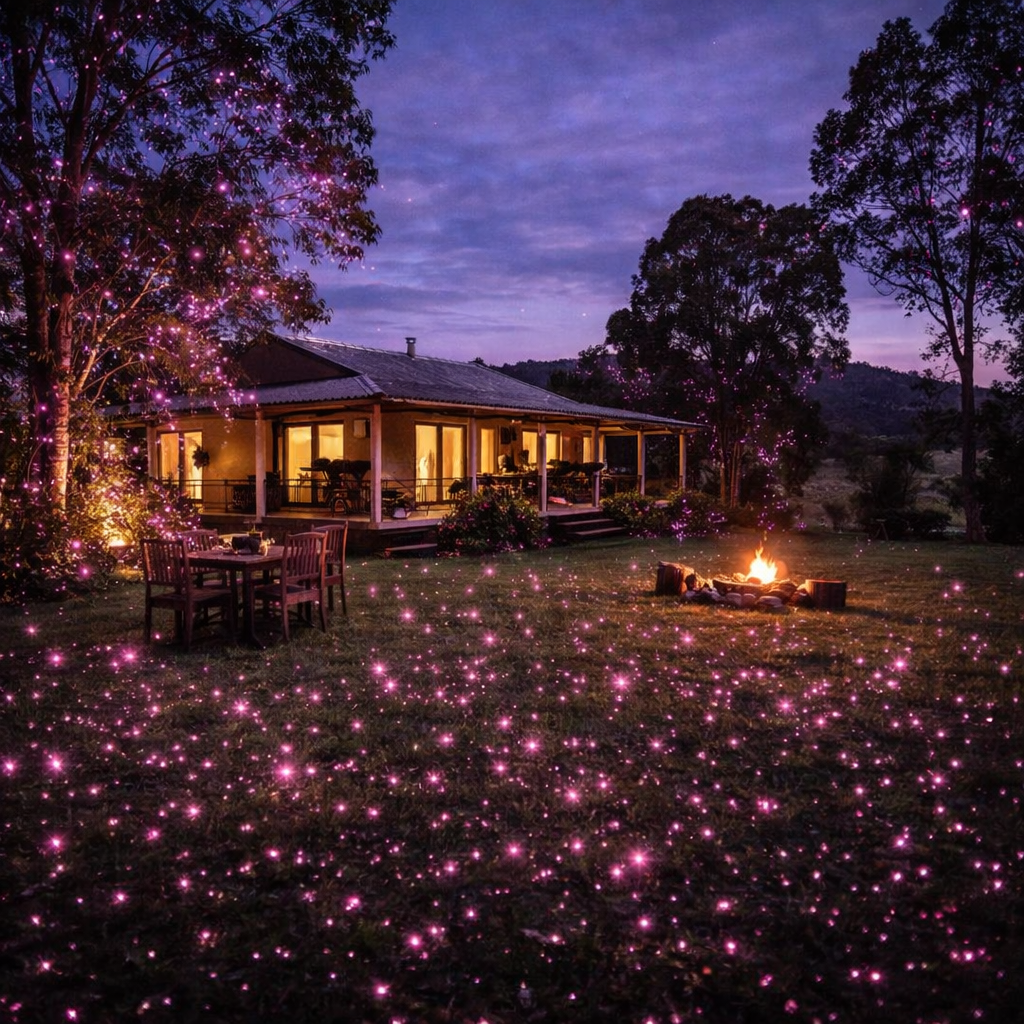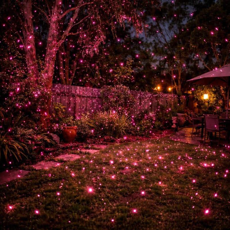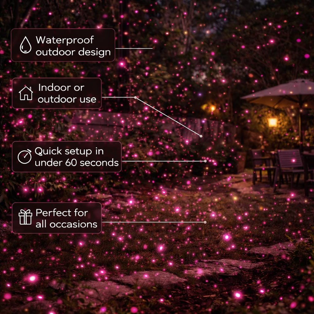 As night falls, thousands of soft pink light points drift gently across trees, garden walls, and outdoor spaces, moving like a calm snowfall of light. The effect is immersive, elegant, and quietly breathtaking.