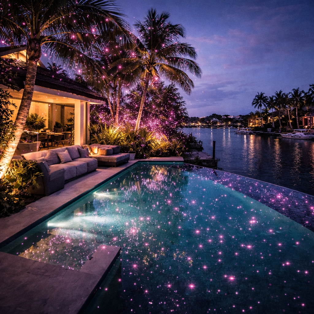 One Crystal Lightfall™ unit illuminates expansive outdoor areas with layered, dimensional light. Create resort-quality ambiance across your entire garden.